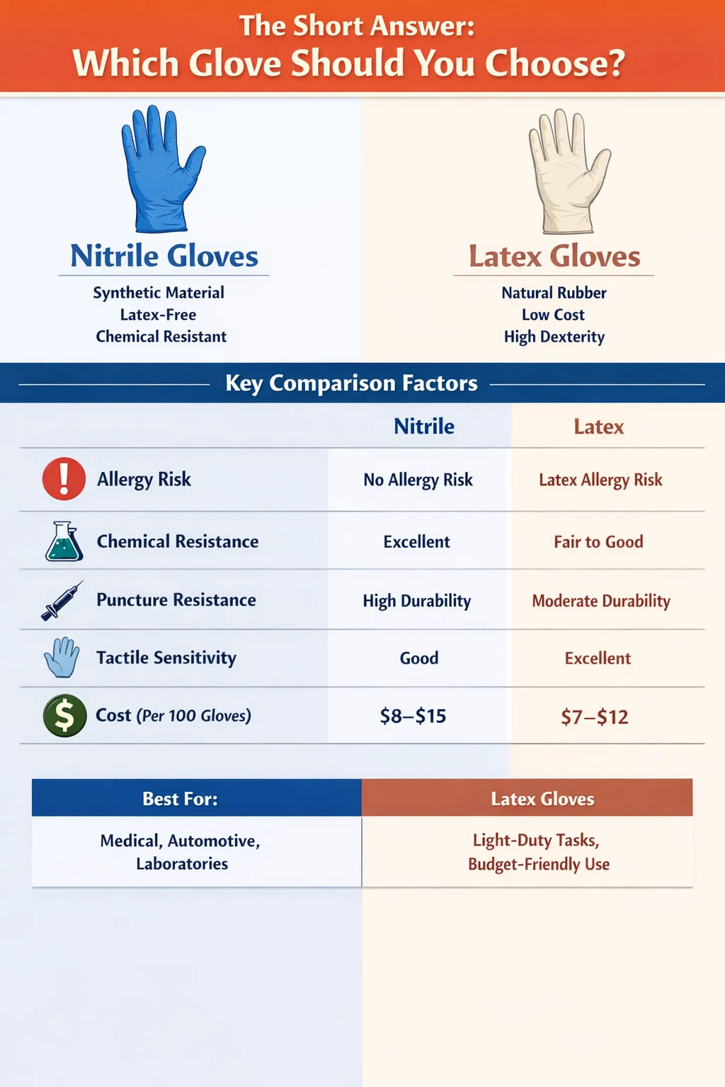 Følgende tabell oppsummerer de viktigste forskjellene mellom nitril- og latekshansker på tvers av de viktigste ytelses- og praktiske faktorene: