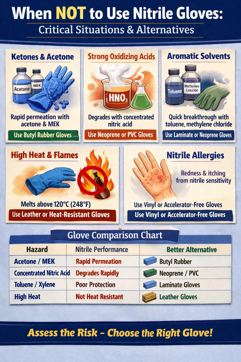 Det korte svaret: unngå nitrilhansker når du håndterer visse ketoner, sterke oksiderende syrer eller høyt konsentrerte løsemidler; når du arbeider med ekstrem varme eller åpen ild; når fin taktil fingerferdighet er kritisk og oppgavens varighet er kort; eller når personen som bærer dem har en dokumentert nitrilfølsomhet. Les videre for hele oversikten.